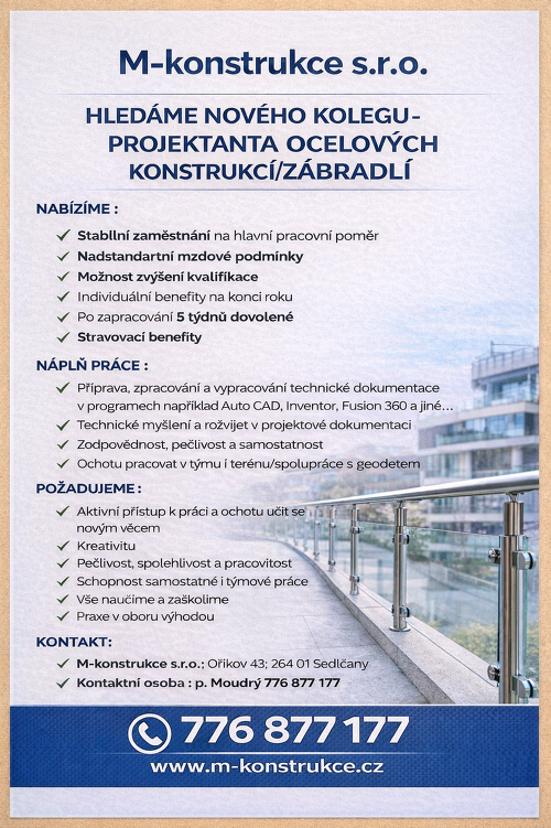 HLEDÁME NOVÉHO KOLEGU-PROJEKTANTA OCELOVÝCH KONSTRUKCÍ/ZÁBRADLÍ